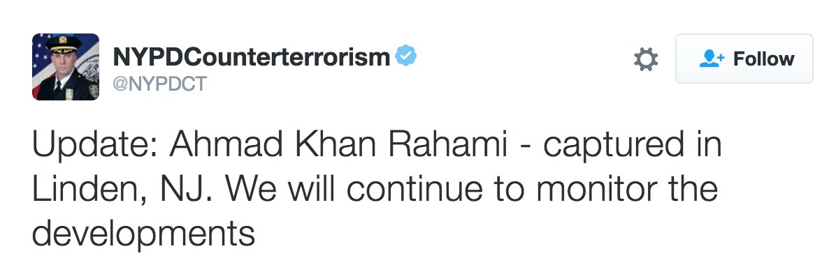 LATEST: NYPD confirms man wanted in connection with bombings captured in Linden, NJ. http://abcn.ws/2d5Wq7B pic.twitter.com/Yl9PT5POAc