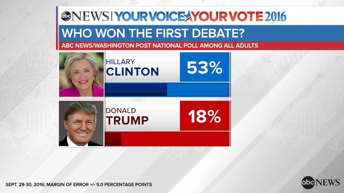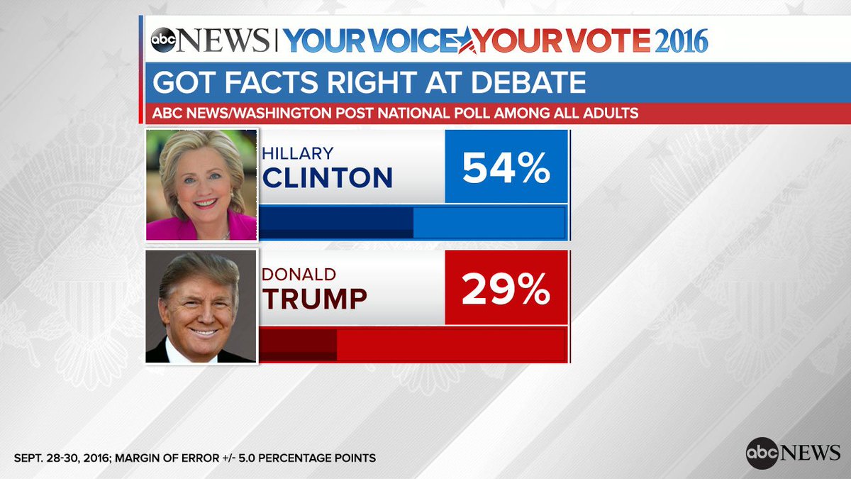 54% in @ABC News/WaPo poll thought Clinton got the facts right in Monday’s debate, compared to 29% for Trump: http://abcn.ws/2dkAhAH pic.twitter.com/Y2aeoY8kaQ