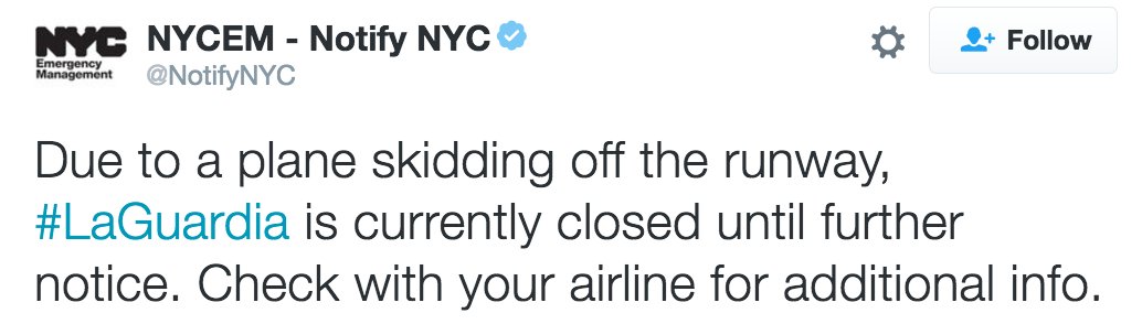 JUST IN: NYC's LaGuardia Airport "closed until further notice" after plane carrying Mike Pence skids off runway. http://abcn.ws/2eKTDgr pic.twitter.com/GY3771fous