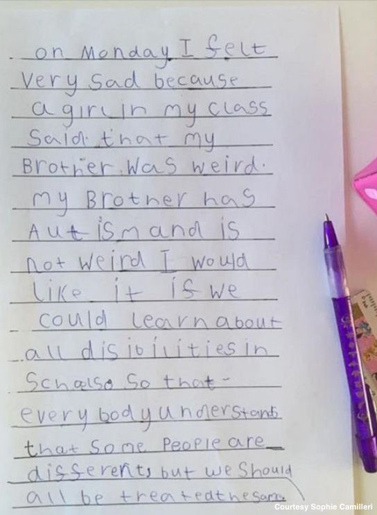I'm impressed she spelled "weird" correctly. Most adults I know get it wrong. Good for her for standing up for her brother.