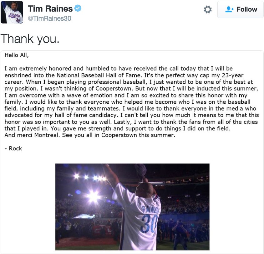 Newly elected Baseball Hall of Famer Tim Raines "honored and humbled to have received the call today." http://abcn.ws/2iCYAha pic.twitter.com/zT5LpWbGZY