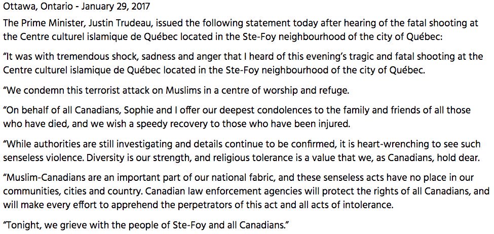 JUST IN: Police in Quebec say six people are dead, eight injured, in mosque shooting Canadian PM Trudeau has condemned as 'terrorist attack'pic.twitter.com/bvscJDjXUa