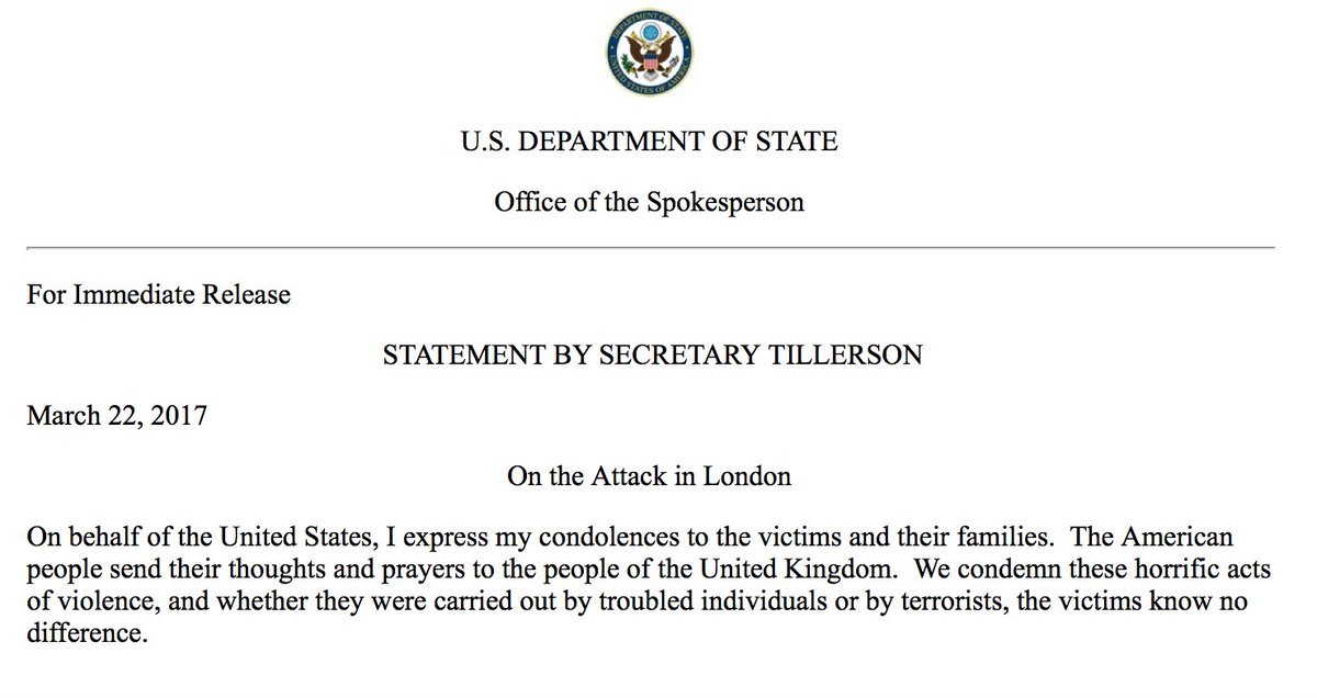 NEW: Sec. of State Tillerson on London attack: "The American people send their thoughts and prayers to the people of the United Kingdom."pic.twitter.com/0xyRvZJciV