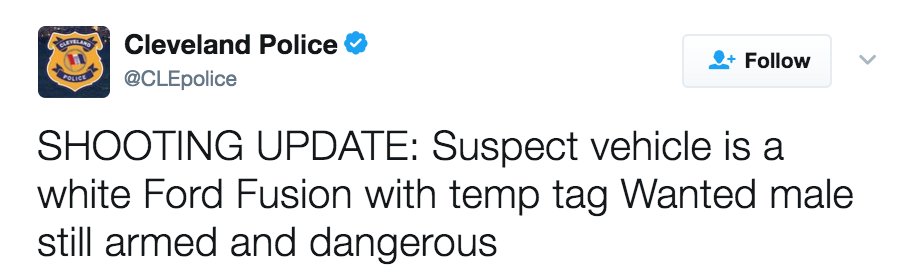 LATEST: -Cleveland police say suspect is driving white Ford Fusion; -FBI assisting; -No additional victims found, though search continues.pic.twitter.com/pJNmlA2VS5