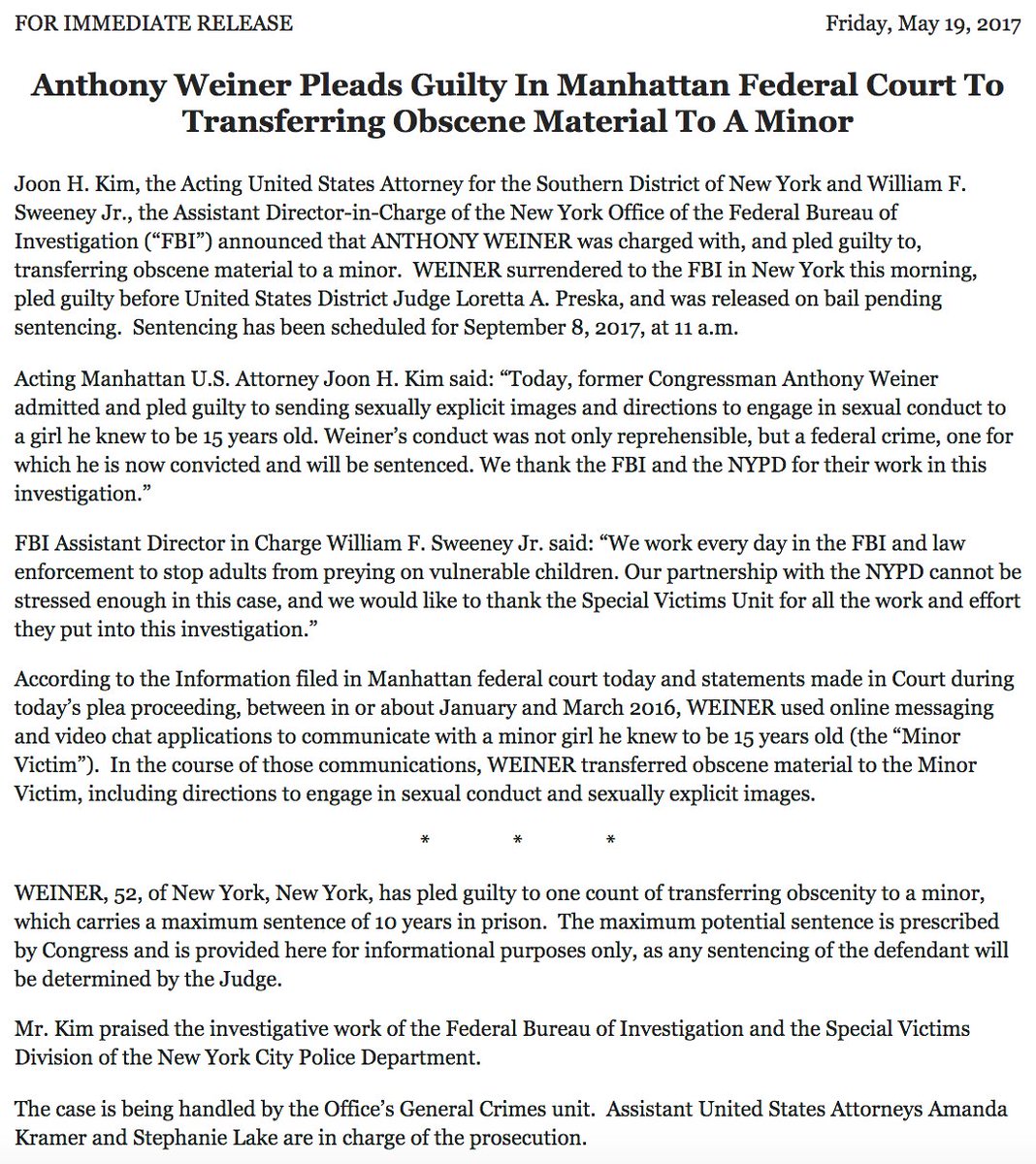 JUST IN: Anthony Weiner pleads guilty to transferring obscene material to minor; released on bail pending sentencing http://abcn.ws/2rlTJoe pic.twitter.com/iFgI0ppPOK
