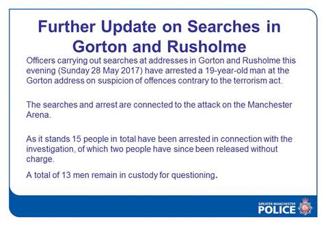 LATEST: Manchester police arrest 19-year-old in connection with arena bombing; 13 currently detained. http://abcn.ws/2ruN0bQ pic.twitter.com/0fRZ5nfRdP