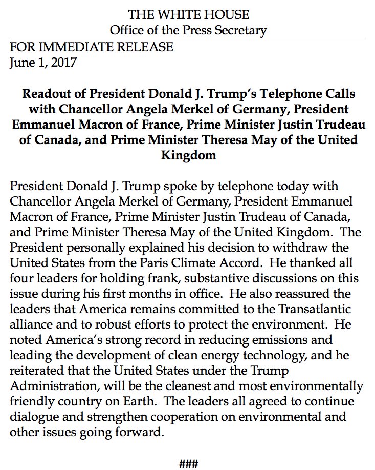 White House: Pres. Trump spoke with leaders of Germany, France, Canada and UK to "personally" explain decision to pull out of Paris accord.pic.twitter.com/2UQ2SfCk5d