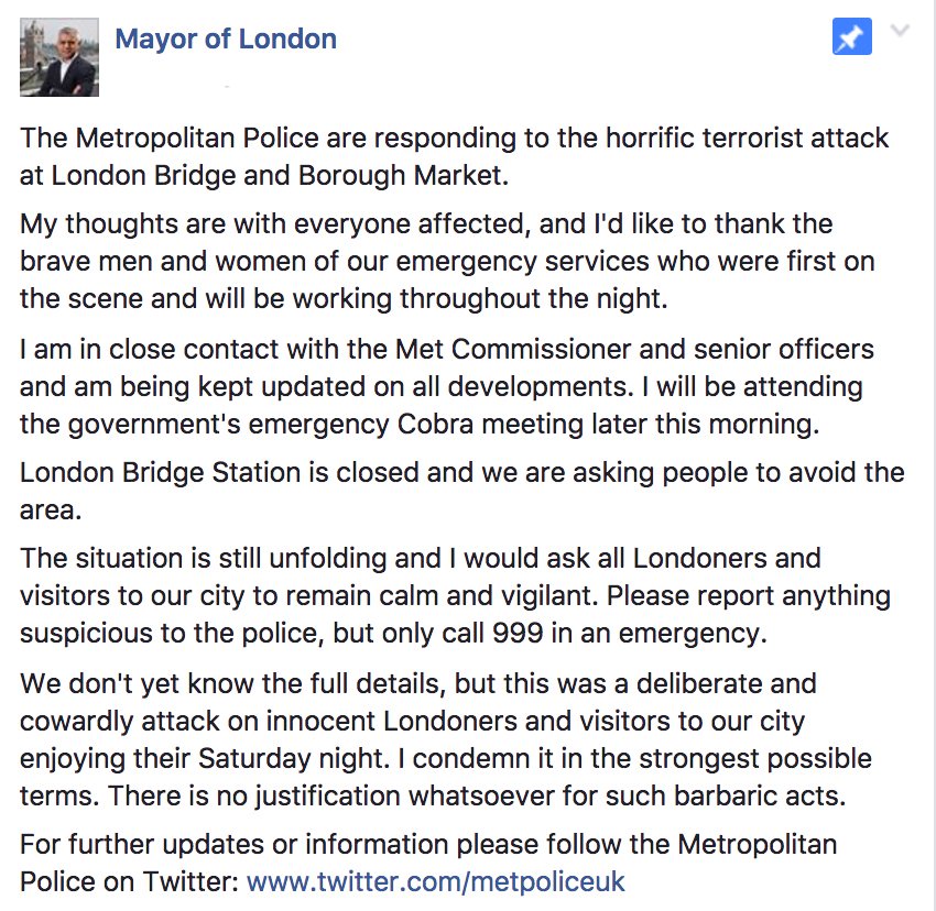 Mayor of London: "The Metropolitan Police are responding to the horrific terrorist attack at London Bridge and Borough Market."pic.twitter.com/LnPj4c8p2l