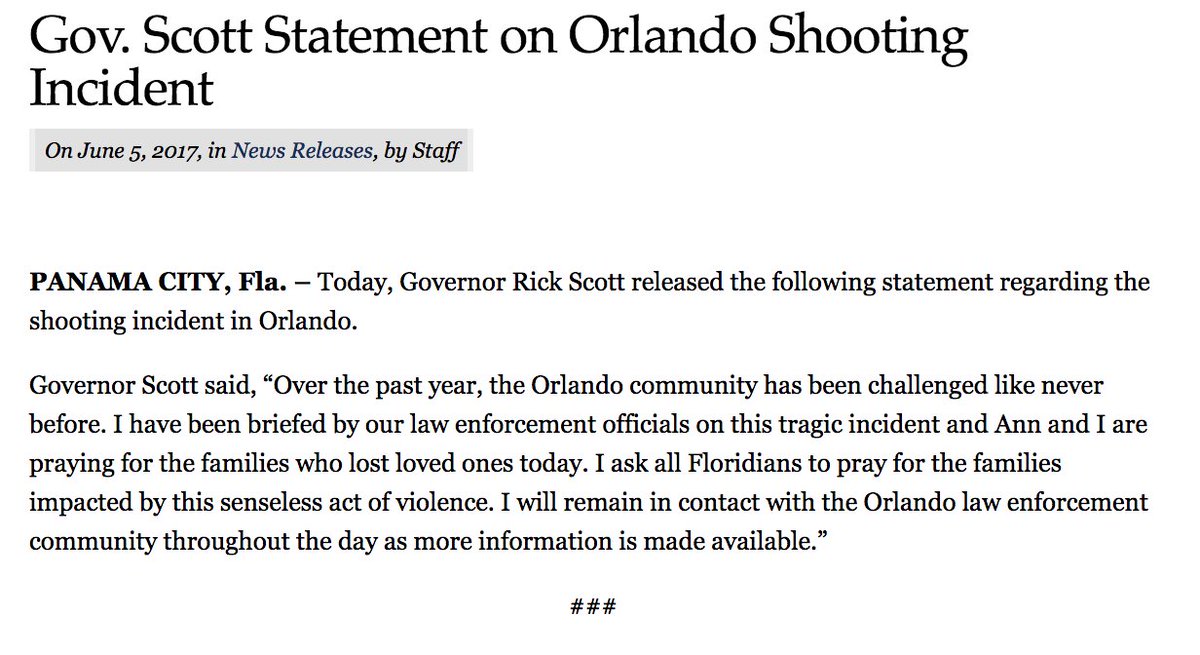 FL Gov. Scott on deadly shooting near Orlando: “I ask all Floridians to pray for the families impacted by this senseless act of violence.”pic.twitter.com/pOOTN7QV3m