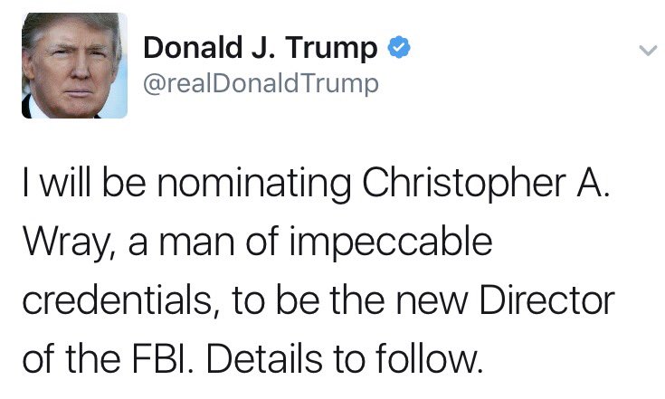 JUST IN: Pres. Trump to nominate Christopher Wray as the new Director of the FBI. http://ABCNews.com/politics pic.twitter.com/3mmBm5BdBv