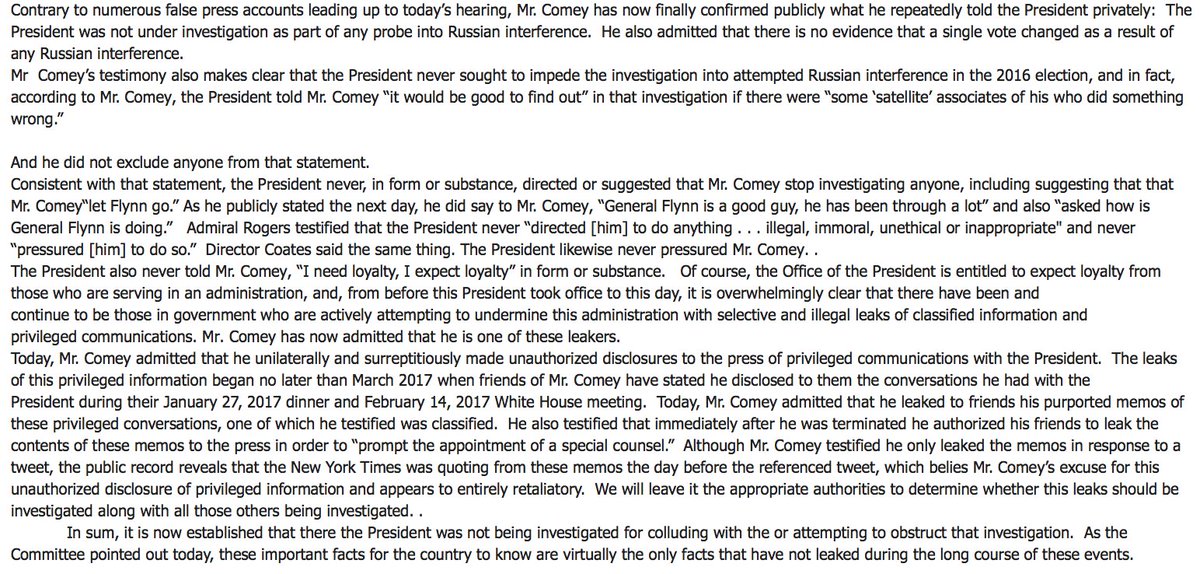 JUST IN: Pres. Trump’s attorney Marc Kasowitz writes Comey’s testimony “makes clear that the President never sought to impede” Russia probe.pic.twitter.com/CaYZ4vvkPE