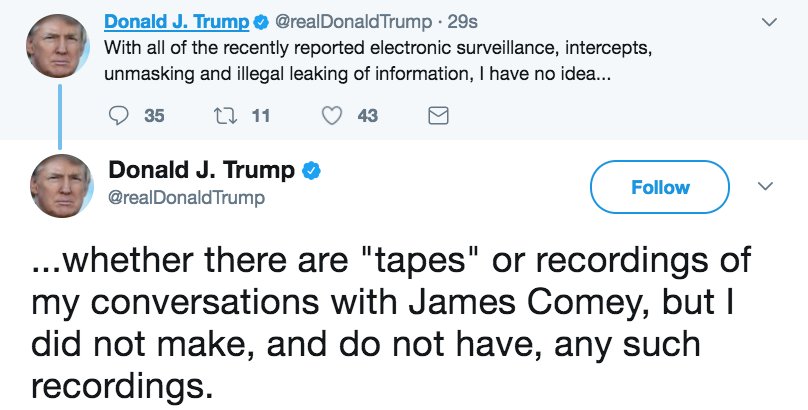 MORE: Pres. Trump: "I did not make, and do not have, any such recordings" of conversations with Comey. http://abcn.ws/2sZYX9L pic.twitter.com/aUFw13a1kA