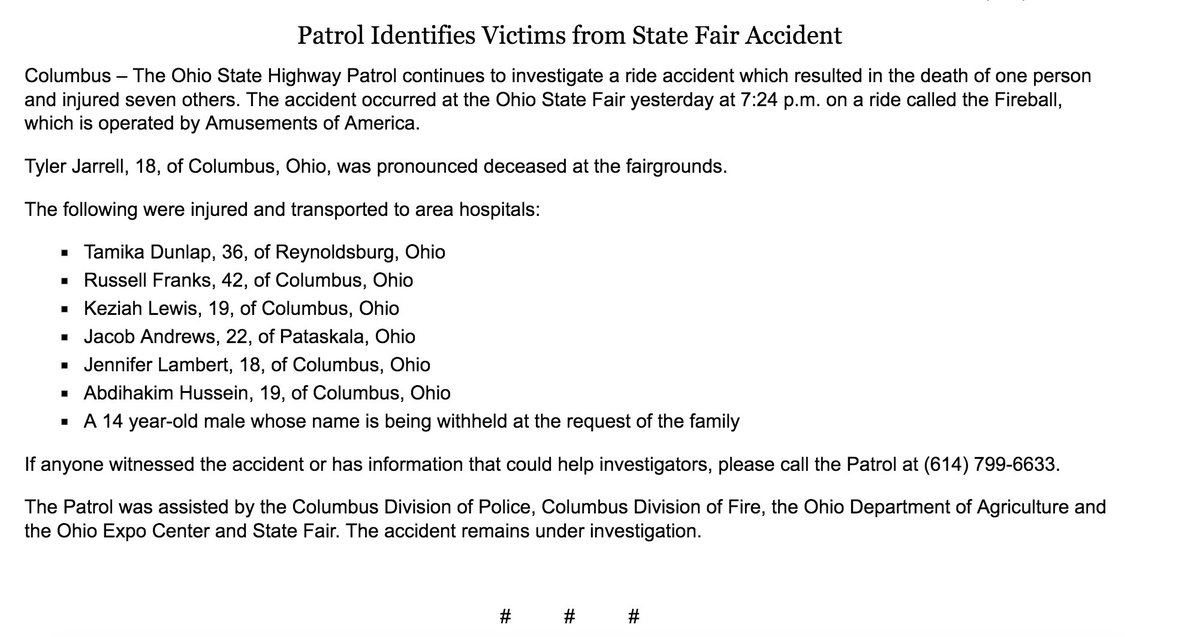 One person has died, 7 injured after incident on ride at Ohio State Fair in Columbus. http://abcn.ws/2tEBIiV pic.twitter.com/Px8LHhYVaT