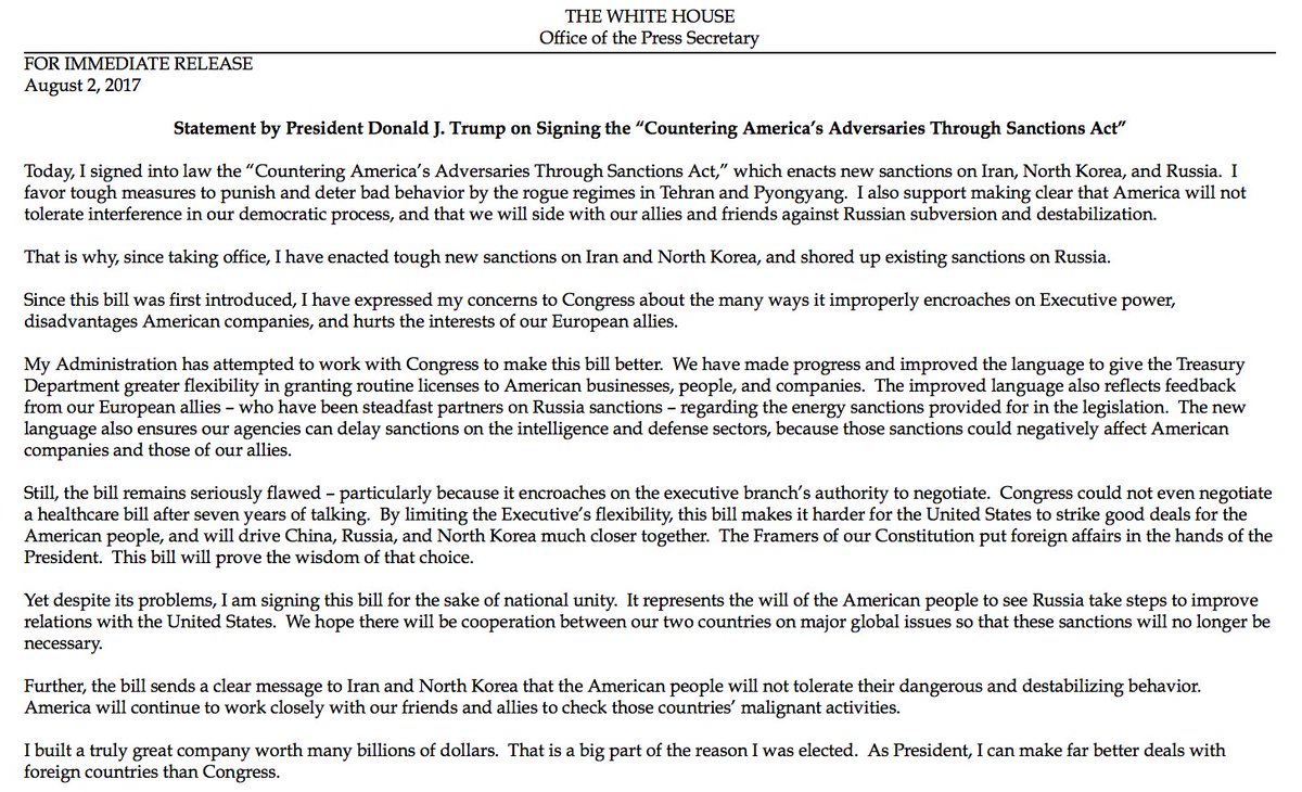 MORE: "Congress could not even negotiate a healthcare bill after seven years of talking," Pres. Trump says in statement on sanctions bill.pic.twitter.com/EeqrkxlTRk