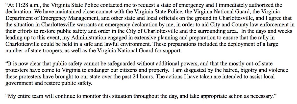 Virginia Gov. McAuliffe on Charlottesville: "I am disgusted by the hatred, bigotry and violence these protesters have brought to our state."pic.twitter.com/NnJgSFLyYd