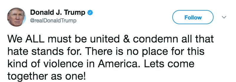 JUST IN: Pres. Trump: "We ALL must be united & condemn all that hate stands for. There is no place for this kind of violence in America."pic.twitter.com/HSW5Rk3PQg