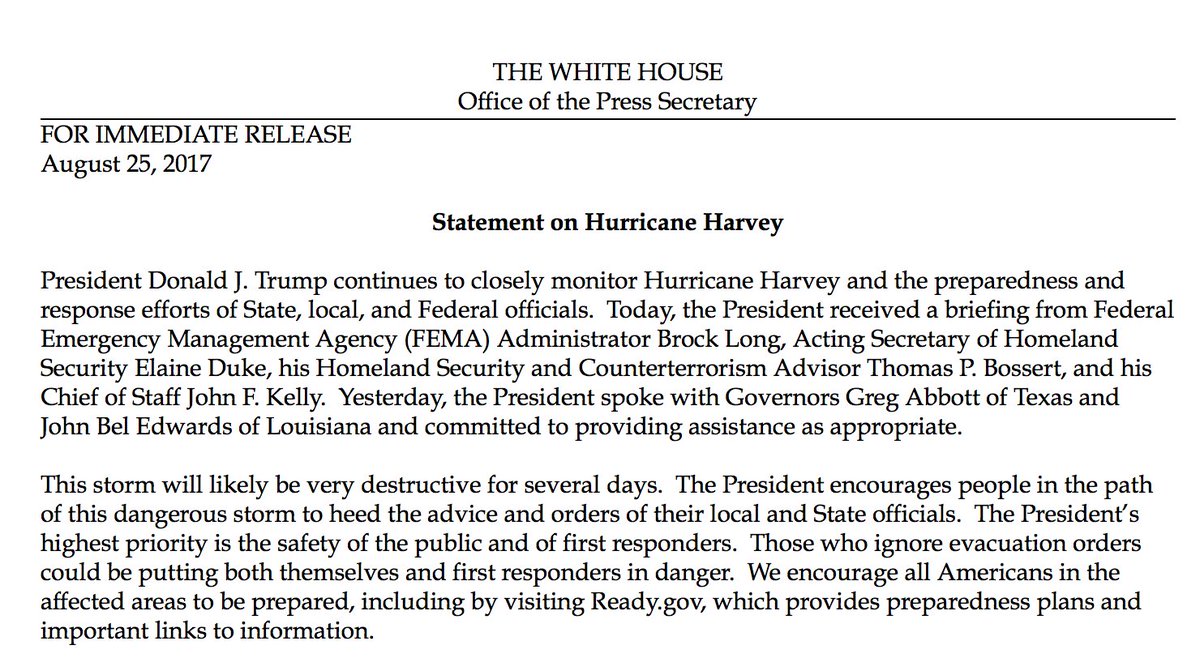 White House: Pres. Trump "continues to closely monitor Hurricane Harvey" and "preparedness and response efforts" of state, local officials.pic.twitter.com/2cMINy1Ltk