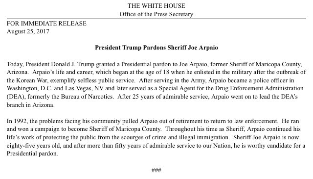 BREAKING: Pres. Trump grants presidential pardon to former Arizona sheriff Joe Arpaio. http://abcnews.com/politics pic.twitter.com/rJFfcZtNol