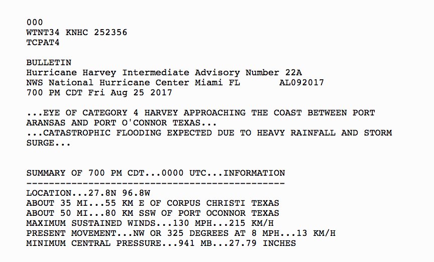 LATEST: Hurricane #Harvey is a Category 4 hurricane and the eye is approaching the Texas coast; catastrophic flooding is expected, NWS says.pic.twitter.com/yU6ejG71BI