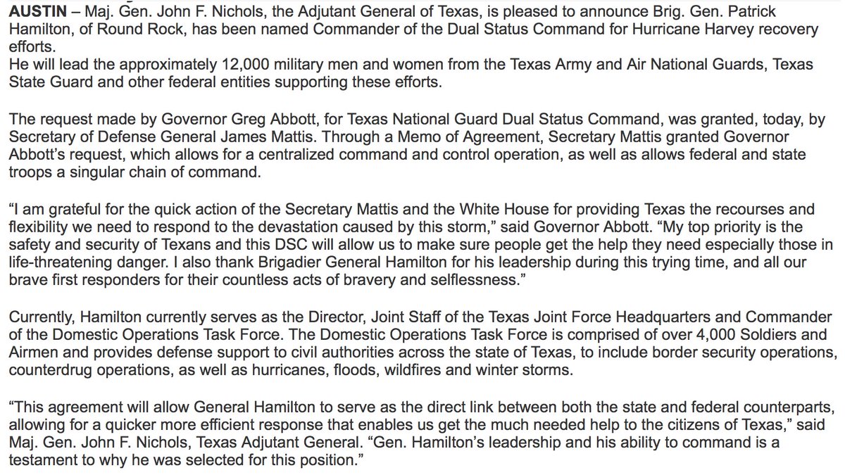 NEW: Brig. Gen. Patrick Hamilton named Commander of Dual Status Command for #Harvey recovery efforts, Texas Military Dept. says.pic.twitter.com/KBp28mJKua
