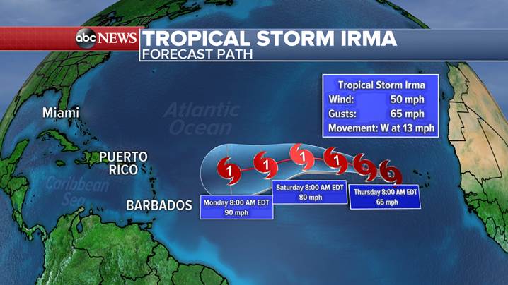 NEW: Tropical Storm Irma forms in Atlantic Ocean, forecast to approach northern Caribbean islands early next week. http://abcn.ws/2vFcCkR pic.twitter.com/A9kHy7fyL0
