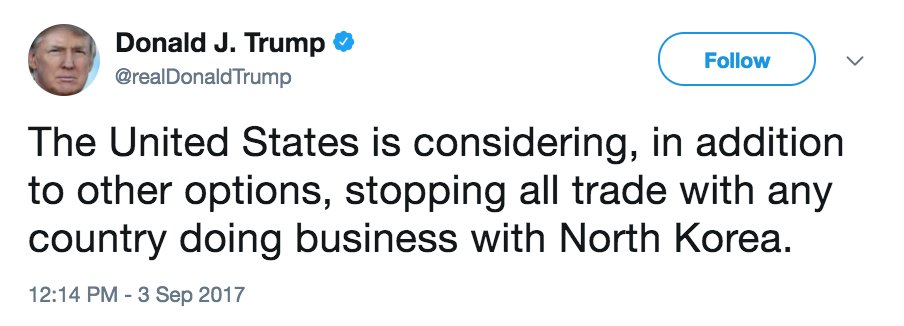 If you stop trade with countries trading with North Korea (Ex. China) you will single handedly destroy our economy