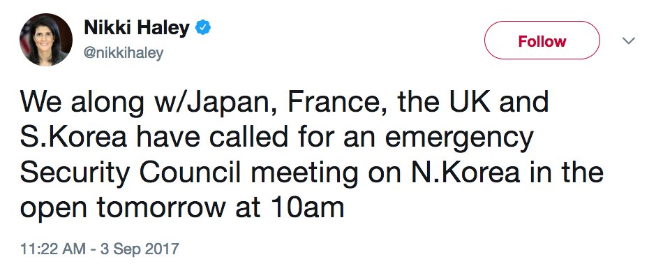 LATEST: Nikki Haley says US, allies have called for emergency meeting of UN Security Council on North Korea tomorrow http://abcn.ws/2vVMUHW pic.twitter.com/MCX2k6lGNY