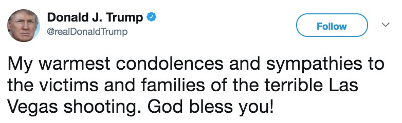 JUST IN: Pres. Trump: "My warmest condolences and sympathies to the victims and families of the terrible Las Vegas shooting. God bless you!"pic.twitter.com/7S6by8gAi3