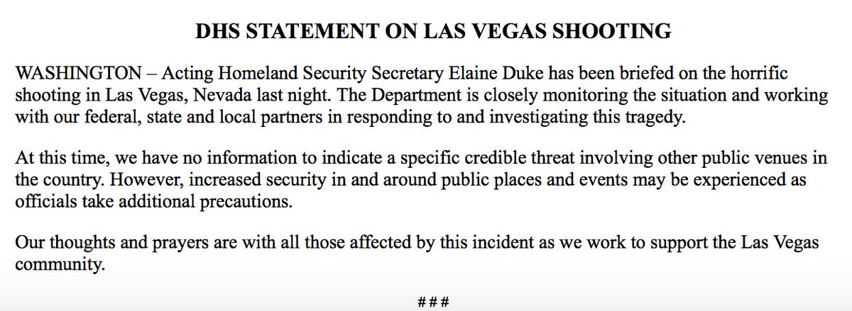 DHS on Vegas shooting: "Closely monitoring the situation and working with our federal, state and local partners in responding."pic.twitter.com/LjpxbChd4d
