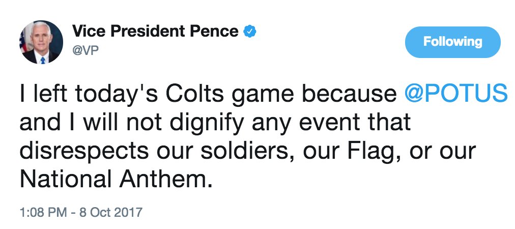 MORE: VP Pence: "I don’t think it’s too much to ask NFL players to respect the Flag and our National Anthem.” http://abcnews.com/sports pic.twitter.com/1NE2yvLTTY