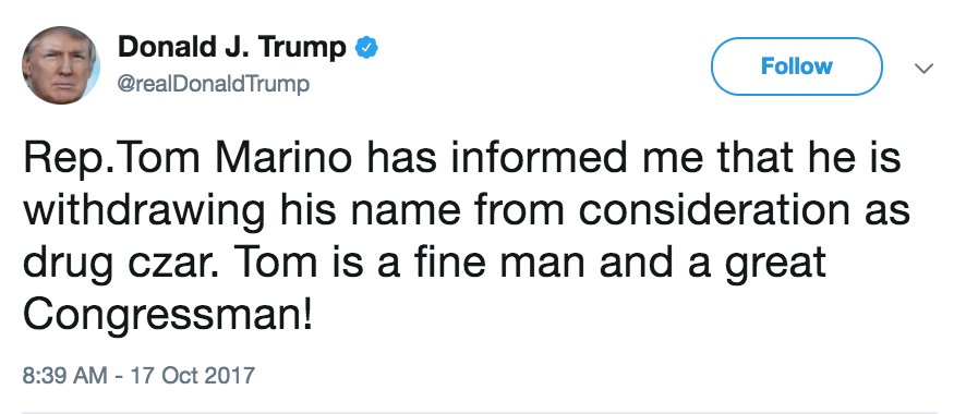 Congressman withdraws bid to be drug czar after report of his role in weakening authority over opioid distribution http://abcn.ws/2zgrDLa pic.twitter.com/nbcyqVq7Ba