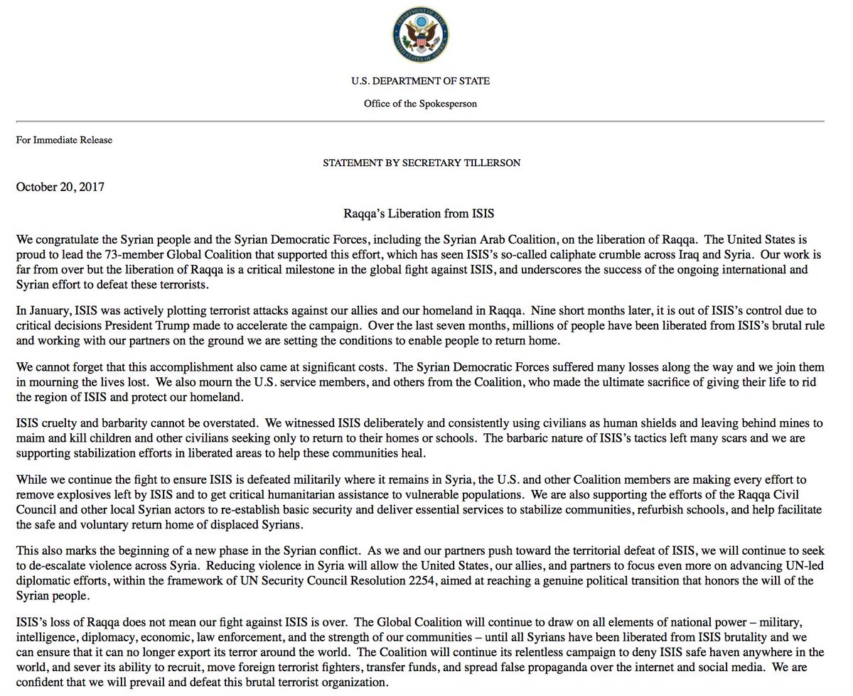 JUST IN: Sec. of State Tillerson: "We congratulate the Syrian people and the Syrian Democratic Forces...on the liberation of Raqqa."pic.twitter.com/6X5eBHiZMv