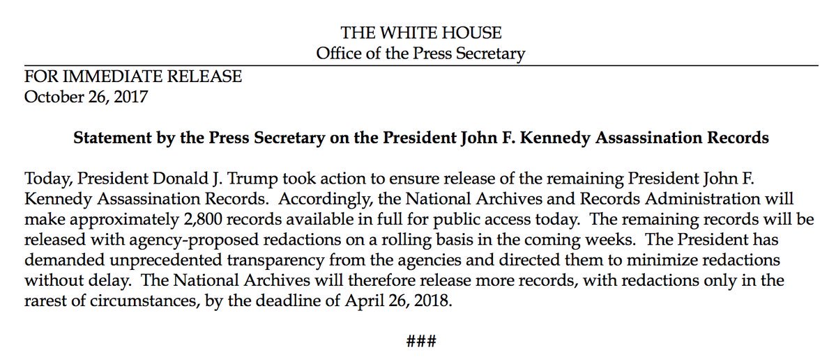 NEW: WH statement on JFK docs: "Remaining records will be released with agency-proposed redactions on a rolling basis in the coming weeks"pic.twitter.com/aKjZVEAclU