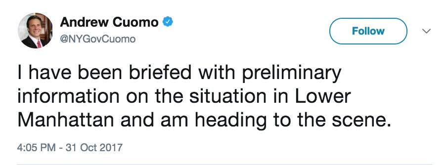 LATEST: New York Gov. Andrew Cuomo headed to scene lower Manhattan. http://abcn.ws/2zm6tQ0 pic.twitter.com/DzdihzMTXf