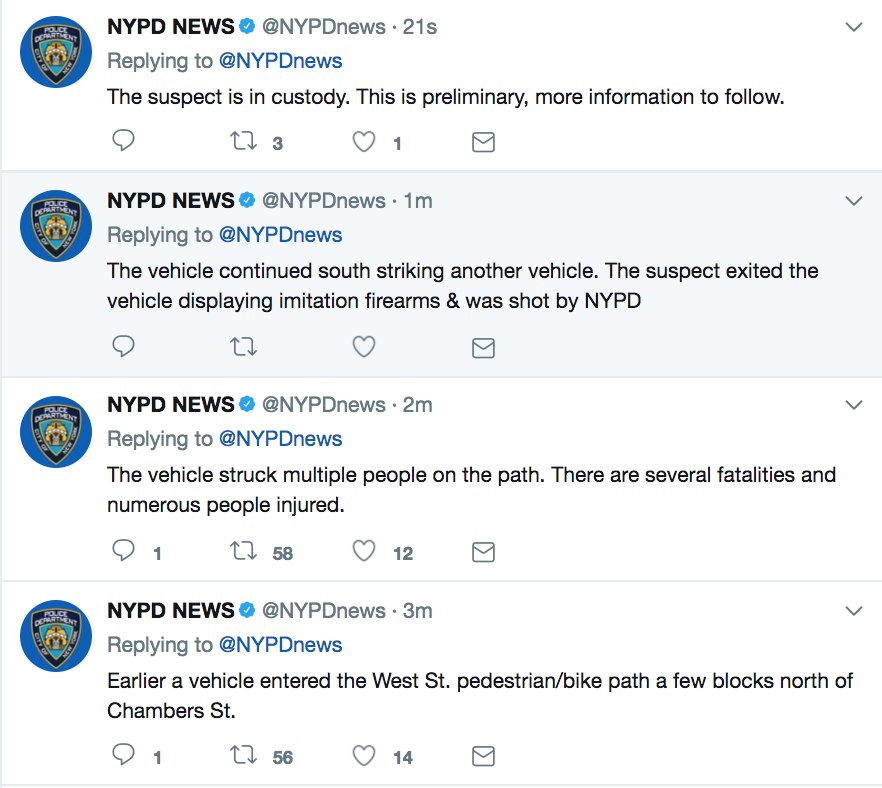 LATEST: Vehicle entered bike path, striking multiple people, NYPD says; "several fatalities and numerous people injured."pic.twitter.com/IH0PG28WpA