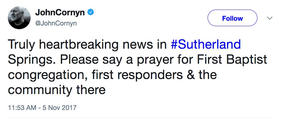 MORE: John Cornyn and Ted Cruz, U.S. senators from Texas, tweet prayers for victims in Texas church shooting. http://abcn.ws/2yxeulg pic.twitter.com/EyCdVMWNYP