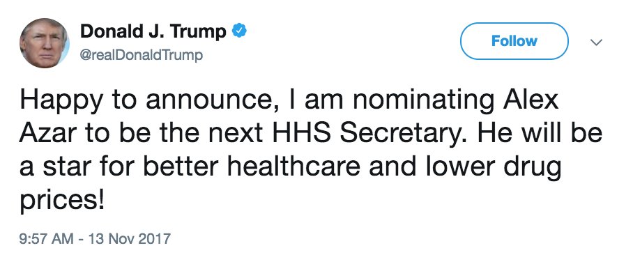 JUST IN: Pres. Trump announces Alex Azar as nominee to lead Health and Human Services: "He will be a star for better healthcare and lower drug prices!"pic.twitter.com/fnYIbaRAcN