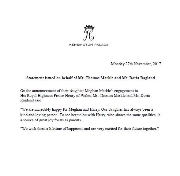 "We wish them a lifetime of happiness," Meghan Markle's parents write of her engagement to Prince Harry. http://abcn.ws/4brxl0 pic.twitter.com/xq50geGs6c