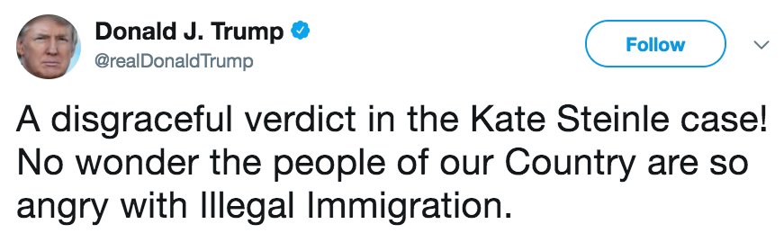 Pres. Trump calls verdict "disgraceful" after San Francisco jury finds undocumented immigrant not guilty of murder of Kate Steinle. http://abcn.ws/2AgEFfA pic.twitter.com/kdtK53DRrP