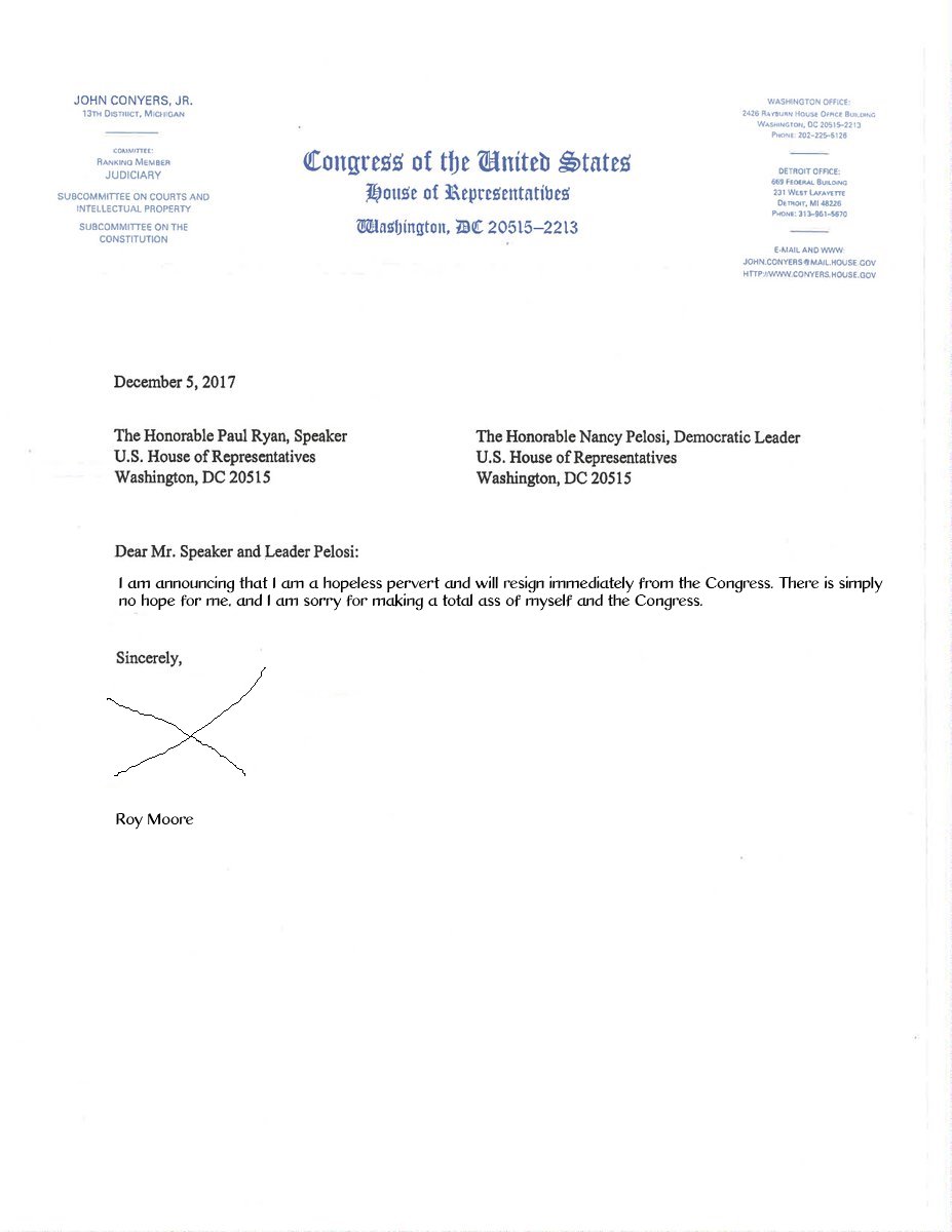 As Rep Conyers resigns. The Donald supports a confirmed child molester and McConnell the party of Reagan keep frailing.