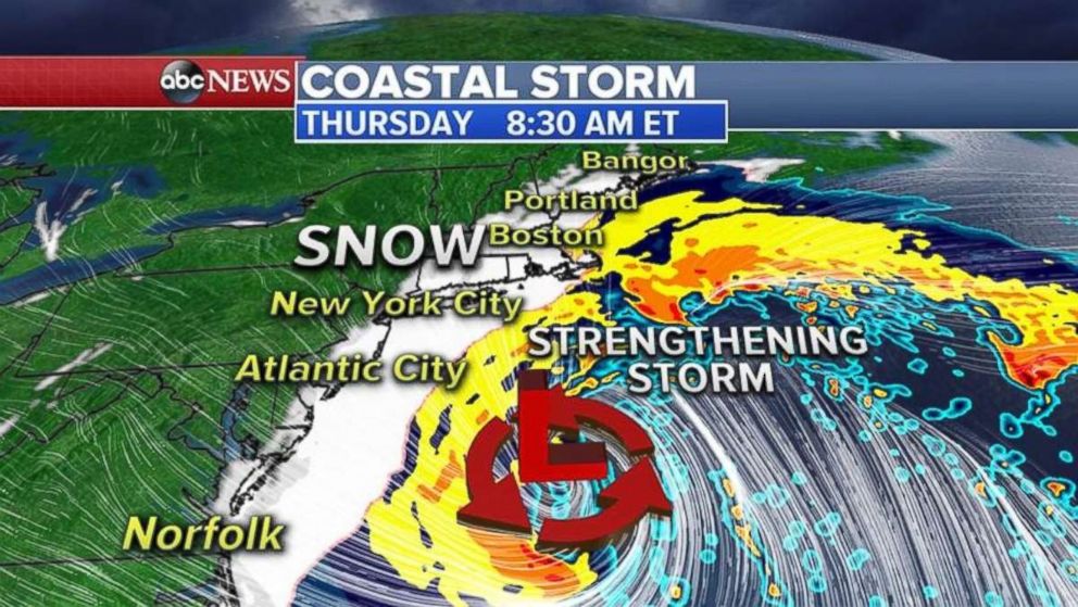 The storm begins to move east of Cape Cod on Thursday, undergoing a rapid intensification, or bombogenesis—when the surface pressure of the storm drops 24 millibars in 24 hours, or the rate of 1 millibar per hour. http://abcn.ws/2CA5uOh pic.twitter.com/Cb80jusCBi