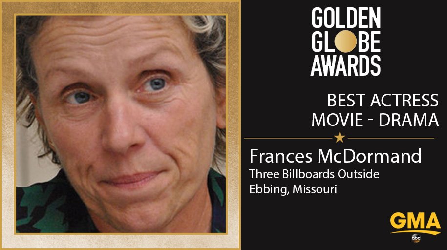 Golden Globe Award for Best Actress in a Motion Picture, Drama goes to Frances McDormand for "Three Billboards Outside Ebbing, Missouri."http://goo.gl/pF36QS