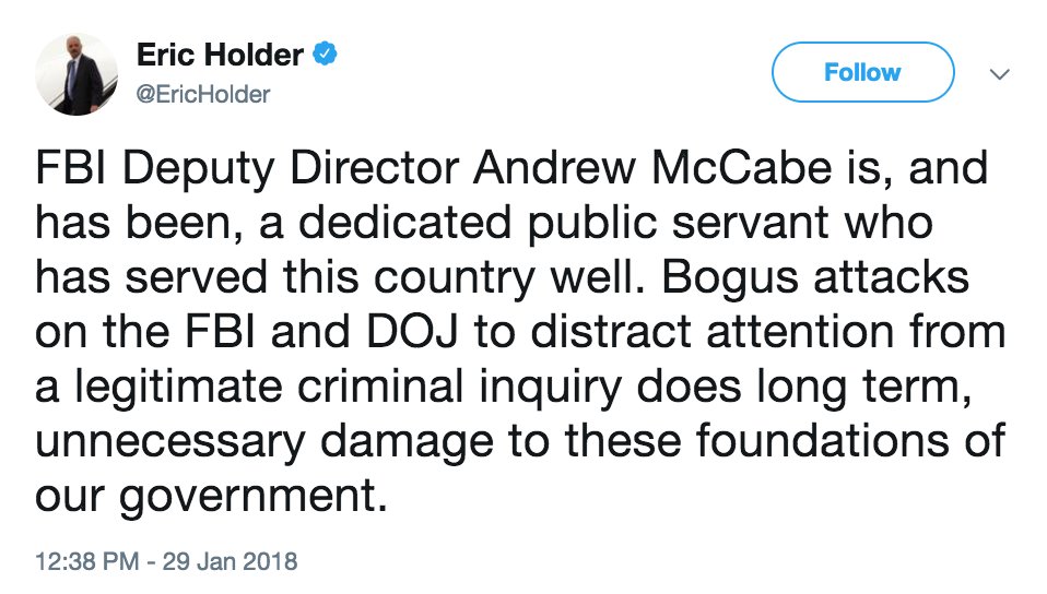 MORE: Former Attorney General Eric Holder: "Bogus attacks on the FBI and DOJ to distract attention from a legitimate criminal inquiry does long term, unnecessary damage to these foundations of our government."pic.twitter.com/avZBszOfJQ