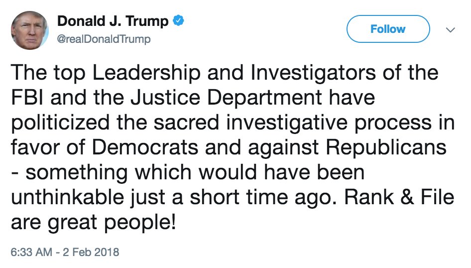 MORE: The “Rank & File are great people,” the president added. The union representing FBI agents has issued a strong statement in support of FBI Director Christopher Wray.http://abcn.ws/2FEukJD