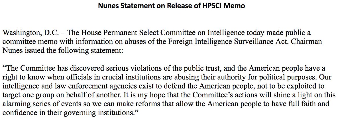 JUST IN: House Intel Committee Chair Devin Nunes releases controversial GOP memo, saying, “The Committee has discovered serious violations of the public trust." The FBI has opposed its release, saying it has "grave concerns" about the memo's accuracy. http://abcn.ws/2FE3jWL pic.twitter.com/Awp15pjGiC