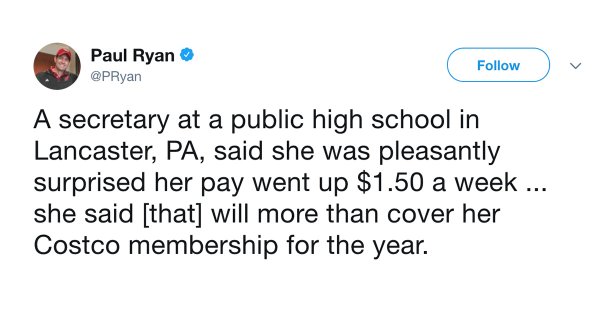 $1.50 per week for that lady $9,615 per week for Ryan (bung that Ryan received from Koch Brothers) $96,150 per week for Ryan for tax cuts provided by Trump to millionaires Sounds fair to me! Quit moaning lady and get your Costco card renewed!