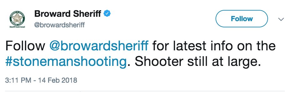 JUST IN: Shooter still at large, Broward County Sheriff's Office says. http://abcn.ws/2o7DlUn pic.twitter.com/hE7s5LQkCg