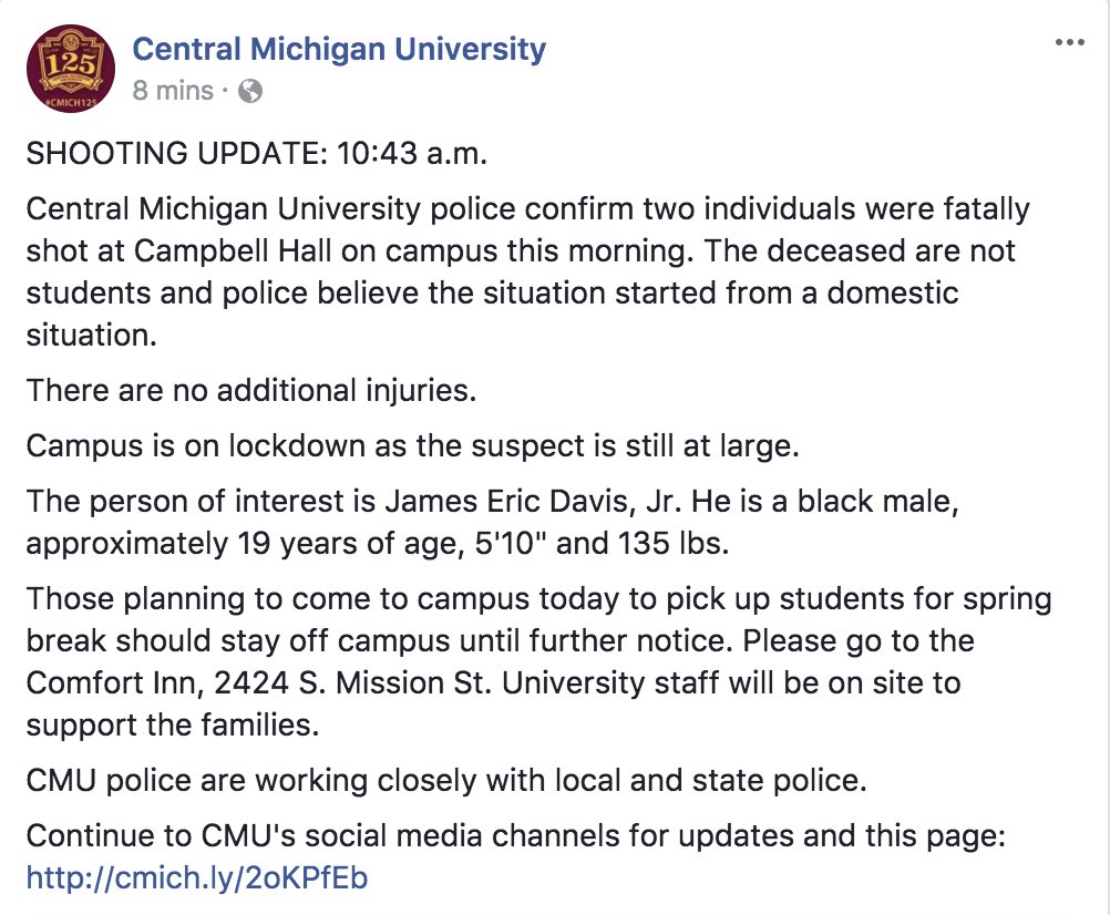 JUST IN: Two dead in shooting at Central Michigan University, school says; deceased are not students, and "police believe the situation started from a domestic situation." Suspect is still at large. http://abcn.ws/2thHDib pic.twitter.com/yUeXIX2MUB