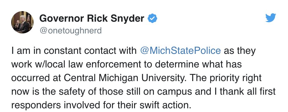 DEVELOPING: Central Michigan University public safety is responding to a report of shots fired on campus. University officials are searching for one subject who fled on foot.pic.twitter.com/HoQnqaSoE6