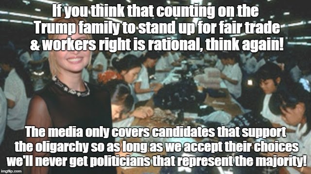 2 of 2 And why does your daughter Ivanka use her status bc of u as President to open sweat shops in China & have them make her fashion clothes instead of good old USA, so American workers come 1st, not Chinese workers at 1 dollar per hr. Stop lying so much Trump.